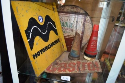 Lot #1112 - Shelf lot of items to incl. Castrol sign