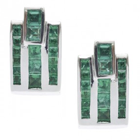 Each earring channel set with square cut Colombian emeralds, to post and butterfly fittings in 18ct white gold. -
