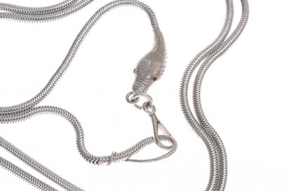 The flexible fox-link chain terminating with a ruby set serpent head and curved tail, total length 1400mm, in Continental silver. -