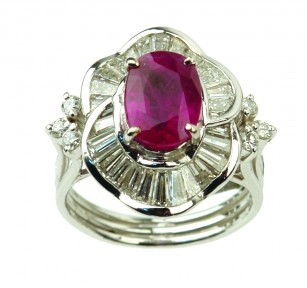 the central 2.85ct. oval standard mixed cut natural ruby held in a 4-claw setting above an undulating wide band of 28 channel set baguette cut diamonds totalling 0.95ct., three small round brilliant cut diamonds flanking to each shoulder, three bar forked shoulders and band. -