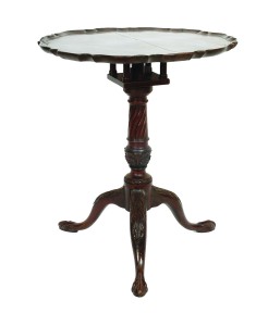 the pie crust top sits on a birdcage tripod base, the column and legs with decorative floral carving, the pad feet with paw detail, the top requires some attention to an old split. 601 x 701. -