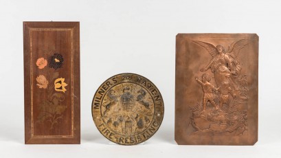 (23 x 31cm); marquetry floral panel (16 x 35cm); brass plaque "Milner's Patent Fire Resisting" (diameter 20cm), 19th & 20th Century. (3 items) -
