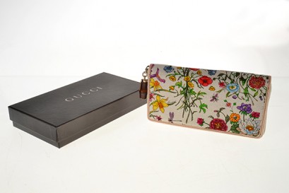 Styled in a multicoloured floral canvas on a cream background with tan leather trim and bamboo toggle, 19 x 10cm, with box. -