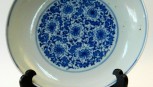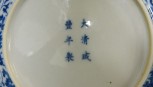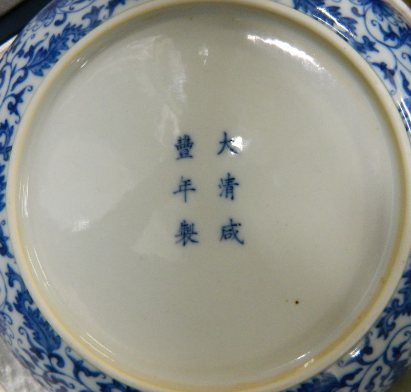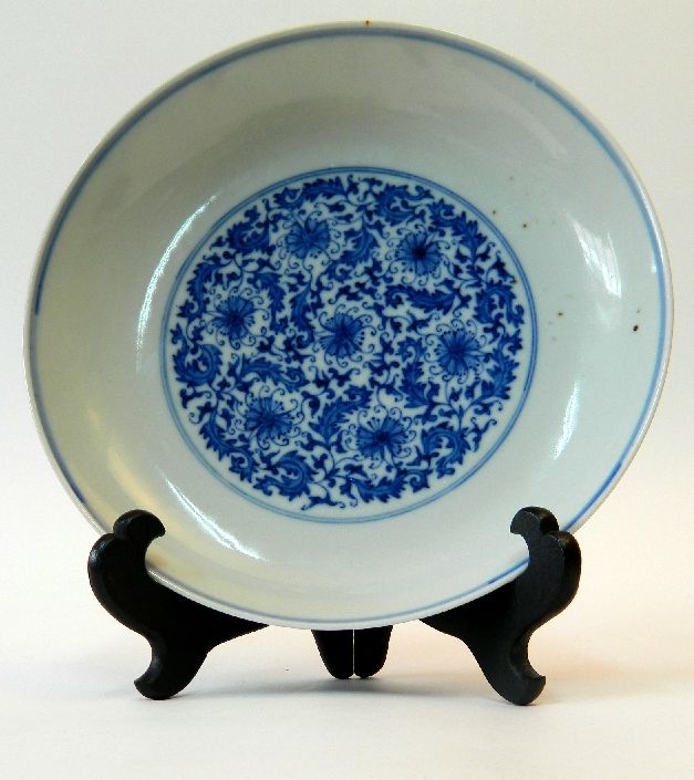 in Underglaze Blue and White. Six character underglaze blue mark Xianfeng 1851-1861. 19th century. The cavetto plain, within two ring is a finely painted central design of flowers & scrolling leaves. Condition: Very Good, except, four pin head sized, iron spots. Fitted Box.