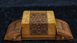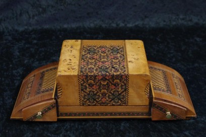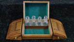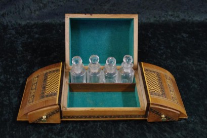 with lift lid revealing 4 glass bottles and small drawers to either side, 33cm wide -