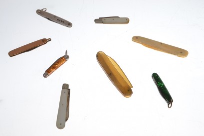 including two plastic, two mother of pearl with sterling blades, one ivory, one horn, one sterling mounted and one gold plated (wear to gold plating) laregst 8.5 cm long -