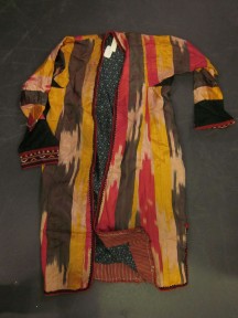 Lot Description:Central Asian silk Ikat robe of pink, yellow and gray