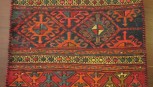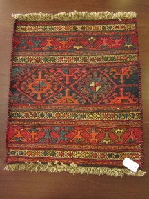 Middle Eastern, worked by hand in striped bands of designs of red, rust, blues, browns and pink, possibly a prayer mat. 48 x 56cm. -