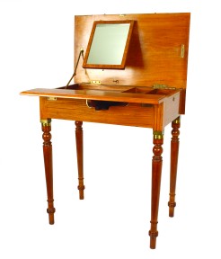 the drop-side top with side hinged opening revealing a fitted interior with hinged mirror, wash basin cavity and concealed drawer, raised on turned legs with screw on brass fittings. 660 x 660 x 740. -