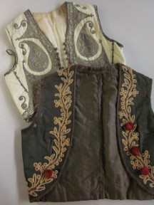 one of cream wool with metal cordwork decoration, the other of green silk with yellow cordwork and red silk pom-poms. (2) -