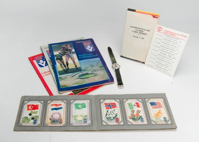 noted 1956 Coles “Olympics, 1st Series” with large flags & national flowers [28] x 3 sets; 1982 Beatrice Publishing “Commonwealth Games Card Series” [c205]; 1990 Collingwood Weg poster; c1960s Olympic watch; Fitzroy member’s season ticket for 1984; Neil Harvey signed display (faults). -