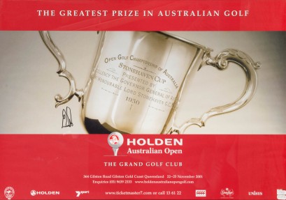 noted “Sherrin” football signed Ron Barassi; “Faulkner” football signed c29 VFL legends; Blake ‘Bilko’ Williams signed display; tennis photo with c15 signatures on mount; Australian Open Golf poster. (5 items) -