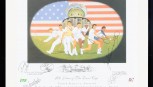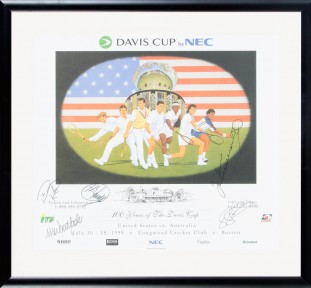 “100 Years of the Davis Cup” print with 5 signatures including Pat Rafter & John Newcombe; plus “Oz Tennis” T-shirt with 15 signatures. All framed, various sizes. (3 items) -