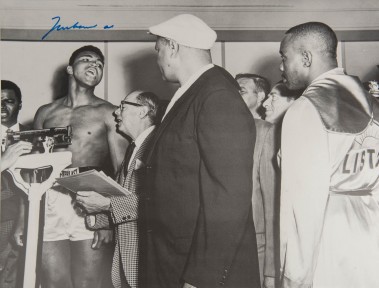 Lot Description:MUHAMMAD ALI, signed b/w photograph of Ali at weigh-in with Sonny Liston