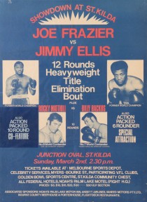 “Showdown at St.Kilda, Joe Frazier vs Jimmy Ellis, 12 Rounds Heavyweight Title Elimination Bout. Junction Oval, St.Kilda, Sunday, March 2nd”, 1975,framed & glazed, overall 60x83cm. -