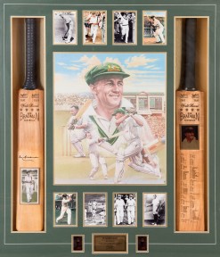 comprising signature on replica “Sykes -Don Bradman” Cricket Bat, mounted with another replica “Sykes -Don Bradman” Cricket Bat engraved with Bradman’s Test centuries, plus Print of Bradman & eight pictures, framed & glazed, overall 98x114cm. With CoA. -