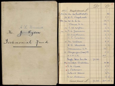 noted c1953-54 accounts book re Lindsay Hassett Testimonial Fund; Official Returns (with attendance figures & gross takings) for 8 matches at MCG 1968-72; colour team photo 1971-72 World XI Team; World XI Christmas Cards (3); also framed print signed Bill Edrich & Denis Compton. -