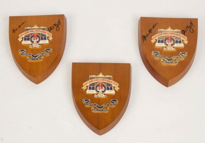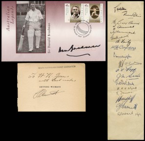 with Don Bradman signed FDCs (4); Clarrie Grimmett; Harold Larwood; teams with 1936-37 England, 1978-79 England, 1991-92 India, 2000 Australian Women, 2003-04 India. Also 1984 Adelaide Oval Centenary Test wall plaques (3 - two signed by captains Allan Border & Clive Lloyd). Mainly G/VG. -