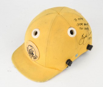 yellow, with “WACA/ SHEFFIELD SHIELD” badge on front, signed & endorsed on side of helmet by Brendan Julian, and dated 93/94, no protective grill. Fair/Good match-used condition. -