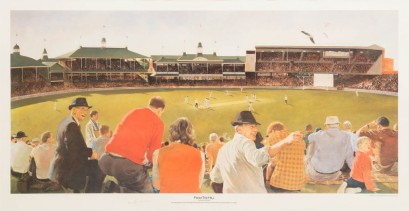 “From the Hill - Don Bradman hits the single that gives him 100 first class centuries, November 15, 1947” by Wesley Walters, signed by Don Bradman in lower margin, window mounted, framed & glazed, overall 123x76cm. -
