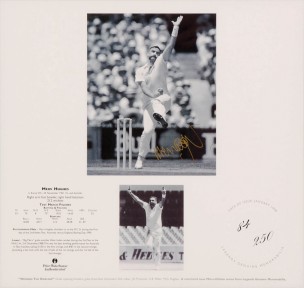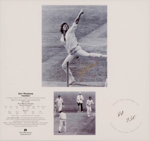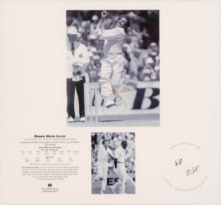 Lot Description:OPENING THE BOWLING, signed prints of Merv Hughes, Keith Miller, Jeff Thomson & Dennis Lillee, each numbered 84/250, each window mounted, framed & gla