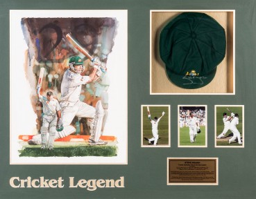 “Cricket Legend” comprising signature on replica “Baggy Green”, window mounted with print of Steve Waugh & 3 photographs, framed & glazed, overall 114x93cm. With CoA. -