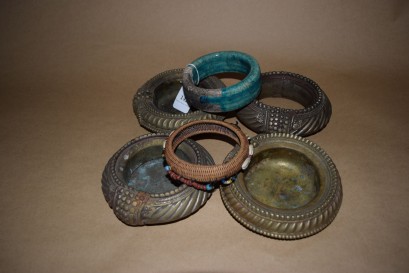 Lot Description:Three silver bangles, two converted to ashtrays, plus two others