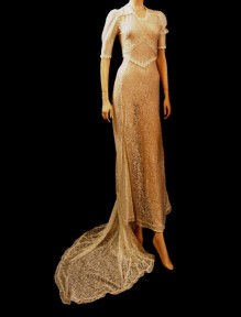 high neck, elbow length sleeve puff shoulder, fishtail train, diamond waistband, loose fitted skirt