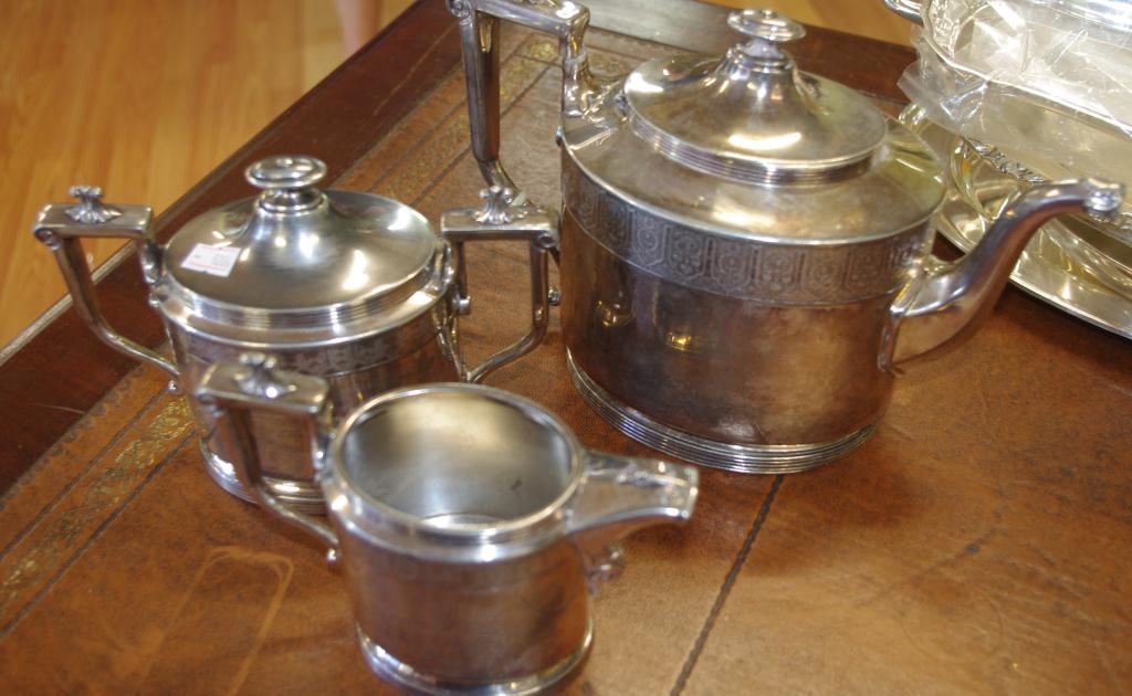 Lot Description:Plated Reed and Barton teapot, sugar & milk