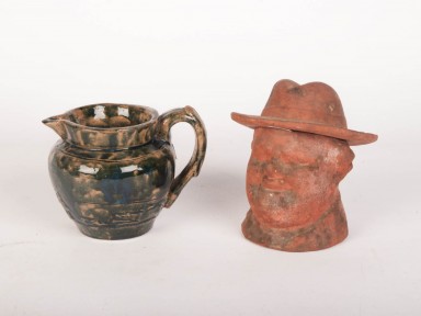Lot #357 - An Australian pottery jug and a box modelled as a gentleman's head, signed P. M. Gourlay, Hobart, 17.3.33