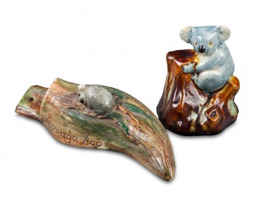Lot Description:A small glazed earthenware figure of a koala and a Taronga Zoo wall pocket, by Grace Secombe, circa 1930