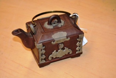 Lot Description:Unusual terracotta teapot with gilded brass effect decoration & a brass swing handle