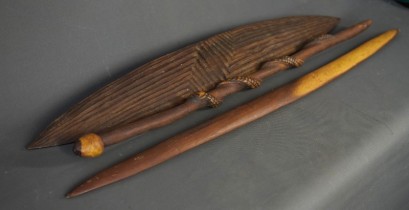 Incl. Wunda style shield; stick with carved snake; & long boomerang. All from acacia wood.