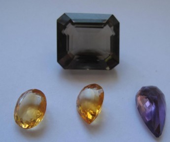Lot Description:Large square cut smokey topaz, pear amethyst with two citrines