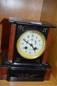 slate & rouge marble cased 8 day movement by F.C. striking on a bell , circular enamel dial with painted floral detail, Arabic numerals, behind bevelled glass door, comes with key & pendulum, note: pendulum & clock movement are both stamped with matching numbers, clock 23cm H -