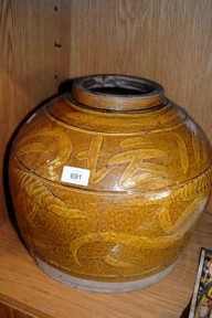 Lot Description:Large Chinese glazed storage pot with image of dragon and calligraphy