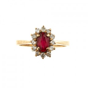In 9ct gold with a central ruby with twelve surrounding diamonds. -