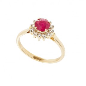 The circular ruby set with twelve small diamonds in a 14ct gold mount. -