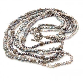 Of grey/black fresh water pearls of mixed size and tones. Approximate length 1760mm. Silver ring clasp. -