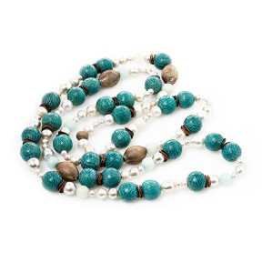 One of dyed matrix turquoise and smokey quartz beads. The other a combination of glass, pearls and leather covered beads.