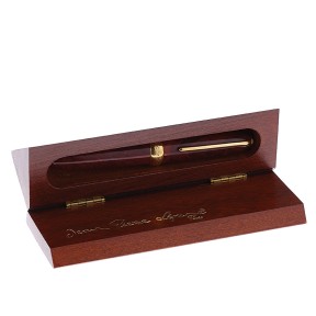 In wood grain finish with gold trim. Wooden box. -