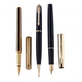 A Parker mechanical pencil; a black and gold Parker fountain pen; a Caran d'Ache hexagon gold fountain pen with 18ct gold nib (ink dry).