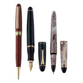 A German green marble and gold fountain pen; a Daniel Hechter marble and gold ball point; a wooden body ball point. Two ink dry. -