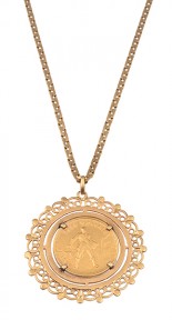 The Russian gold coin dated 1977, mounted in a circular pierced filigree frame, suspended from a flat curb link chain, all in 14ct gold, total length 745mm. -