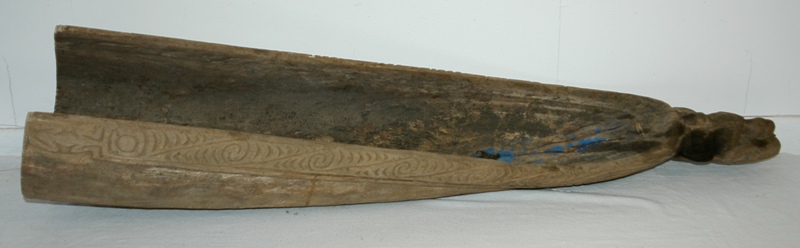 Incised gunwhale terminating in totemic mask. Much use, age patination & weathering. Madang province, 1960's.