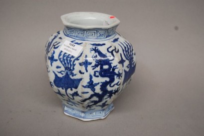 Lot Description:Chinese blue and white hexagon shaped vase with dragon design