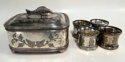 Lot Description:A silver plated lidded sardine dish and four napkin rings