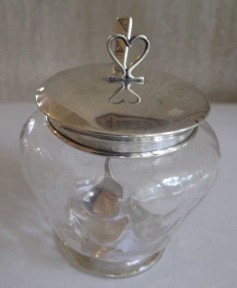 Lot Description:Sterling silver mounted preserve pot with sterling silver spoon