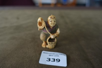 Lot Description:Carved Oriental handpainted signed netsuke of an older man with barrel