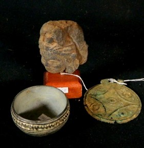 schist fragment: of a head, bowl; of stone, saddle ornament; of metal